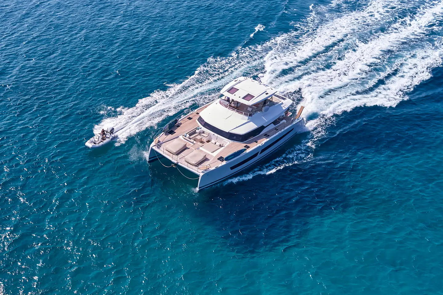 Catamarans have two hulls joined by a wide deck. The wide beam gives you space and stability. The shallow draft lets you anchor close to shore. In Italy this means quiet coves, short swims, and easy shore access.